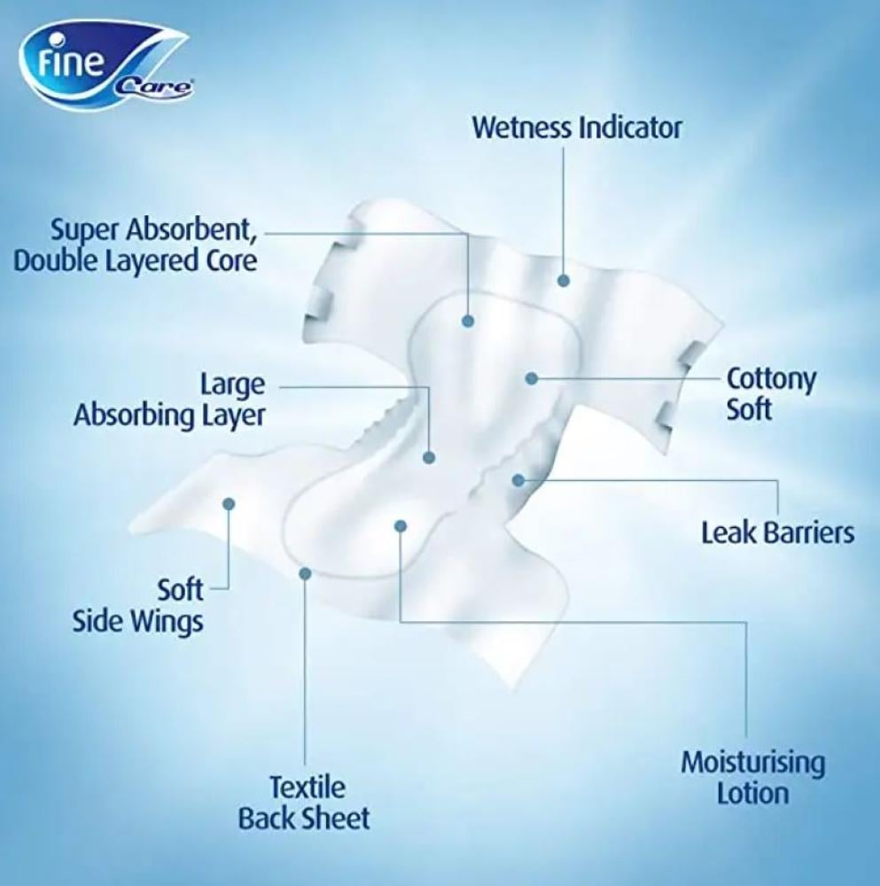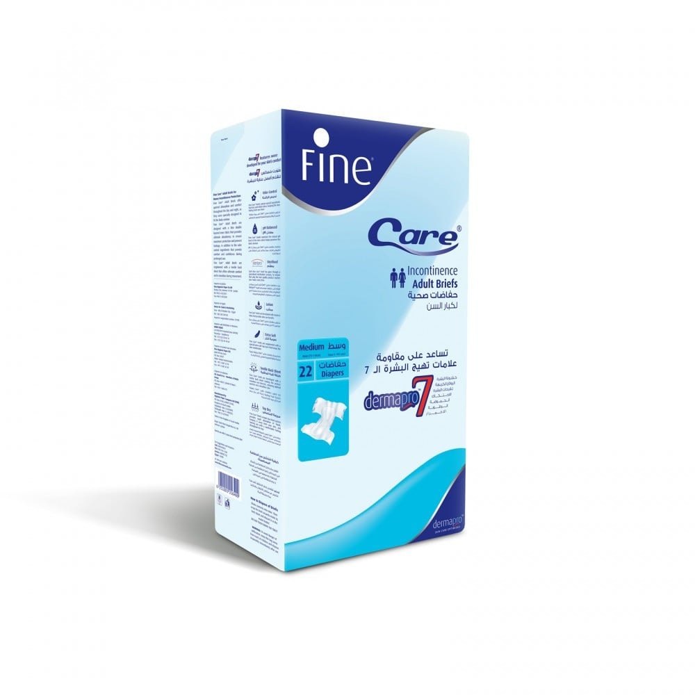 حفاضات فاين كير لكبار السن، مقاس متوسط (22 حفاضة)، مصممة لتوفير حماية فعالة بقصة نحيفة تتناسب مع منحنيات الجسم الطبيعية. تتميز بوجود مؤشر البلل الذي يظهر وقت الحاجة لتغيير الحفاضة، بالإضافة إلى حواجز Double LeakGuard التي تعزز الراحة وتوفر حماية من التسرب بفضل تقنية ConviuFit التي تجعل الحفاضة قريبة من الجسم.