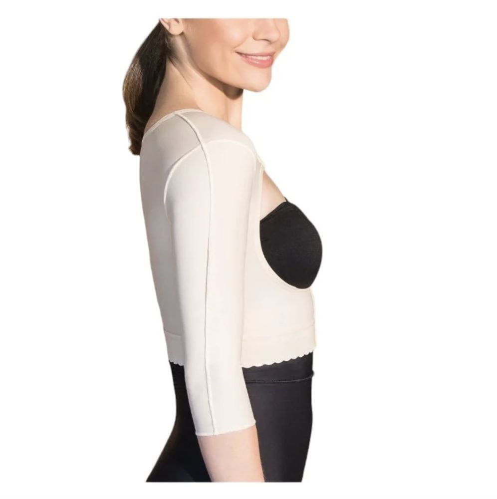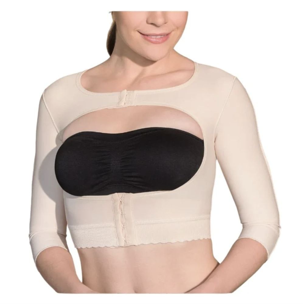 تم تصميم مشد مارينا FVOM ليوفر دعمًا ضاغطًا ومريحًا بعد عمليات شفط الدهون من الذراعين والظهر، حيث يتميز بتصميم مكشوف الصدر ليتناسب مع حمالة الصدر الجراحية بشكل مريح دون ضغط زائد.